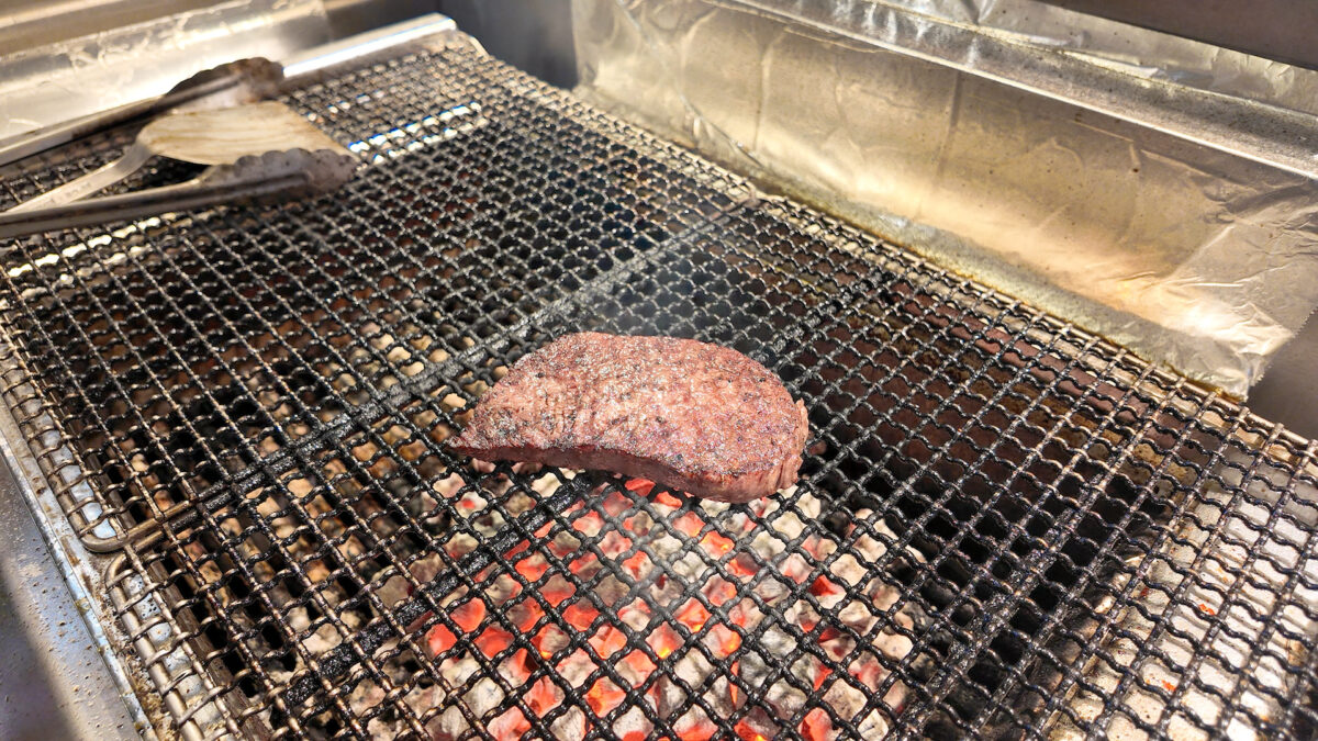ステーキはすべてレアで提供され、あとはお客さんが目の前の網でお好みの焼き加減に調整できるスタイル。