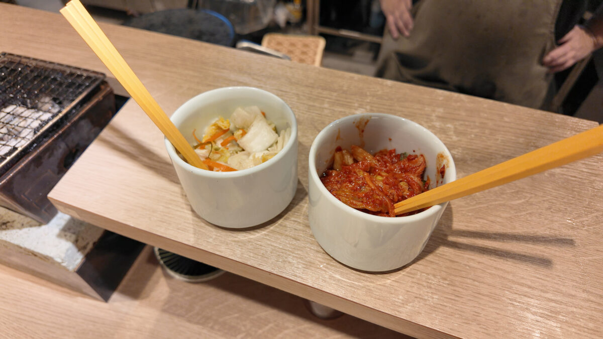 しかもテーブルにはキムチと漬物が置かれ、こちらはなんと食べ放題。ご飯が進みすぎて止まらなくなる、危険な組み合わせです。
