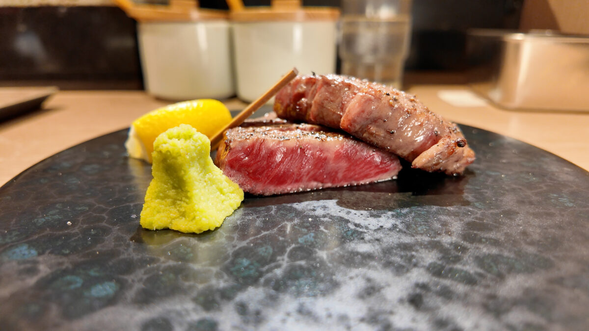 目の前に運ばれてきた瞬間、香りと照りで期待が一気に高まります。表面は香ばしく、中はしっとりレア。
