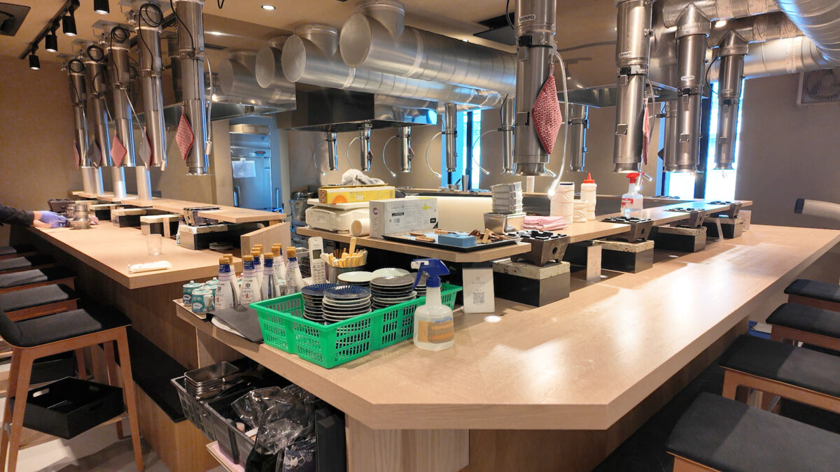 店内はオープンキッチンを囲むようにカウンター席が並び、厨房から立ち上る香ばしい煙が食欲をそそります。
