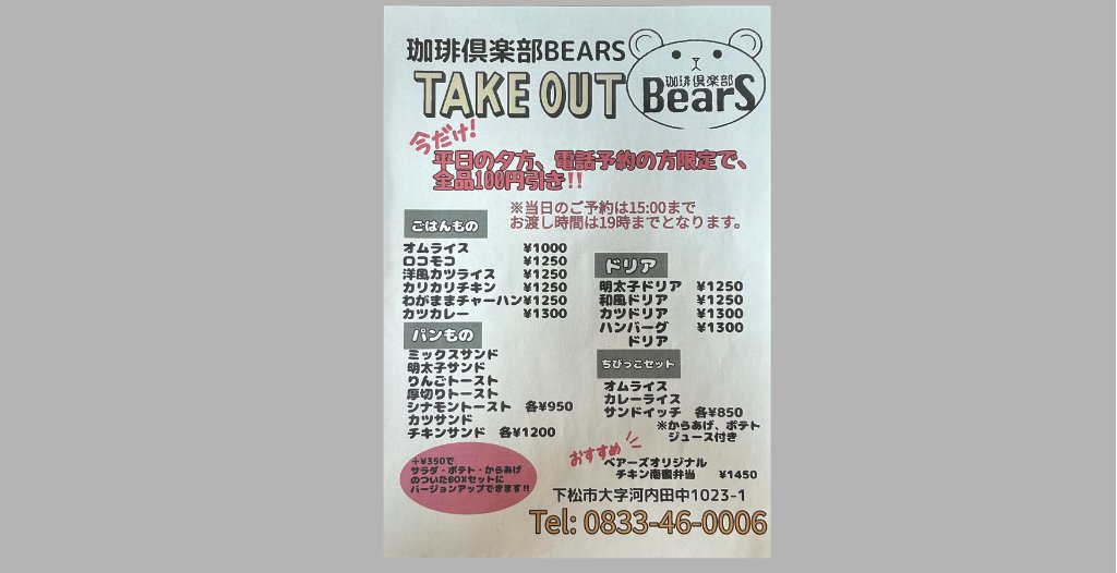そんな「Bears」では、現在テイクアウト割引キャンペーンを実施中!平日の夕方、電話予約に限り、テイクアウトメニューが全品100円オフで注文可能です。