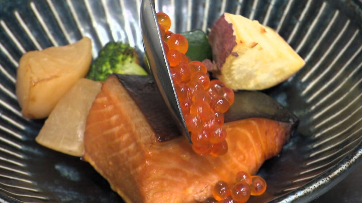付け合わせのサツマイモにイクラをのせて食べるのもおすすめです。