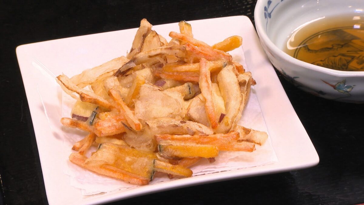 次に、ひときわ大きく存在感を放つ天ぷらをいただきます。カボチャ、サツマイモ、タマネギなど、素材そのものの甘さがギュッと詰まっており、油との相性も抜群。油がくどくなく、さらっといただける軽い仕上がりで、素材の味を邪魔しません。