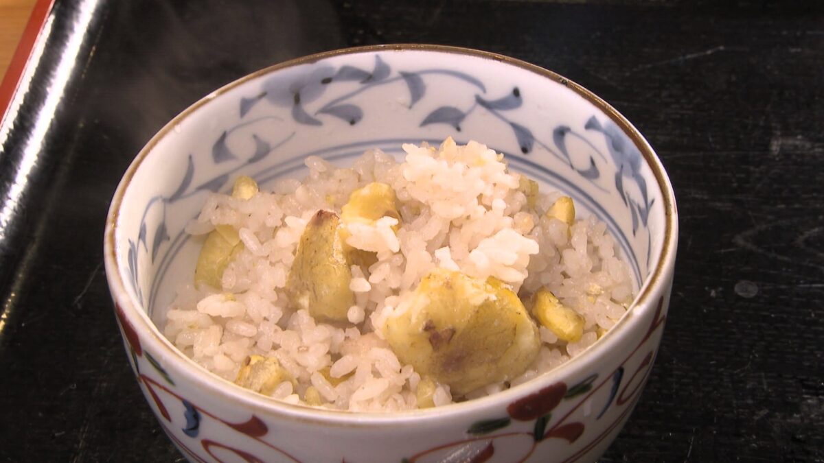 そして、栗がゴロゴロと贅沢に入った「栗の炊き込みご飯」。ホクホクとした栗の甘みが口いっぱいに広がります。味付けは白だしとお塩を薄くしているだけで、栗自体の味が生きるように計算されているとのこと。栗自体の豊かな香りと、ねっとりとした甘さが前面に出ており、素材ひとつひとつを大切にした、丁寧なお料理であることが伝わってきます。