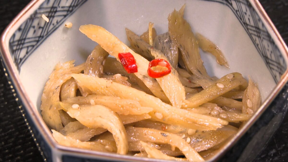「マコモダケ」は、タケノコでもキノコでもないイネ科の植物。皮をむいた白い柔らかい部分をいただくのですが、担当の方曰く「タケノコに近い」とのこと。きんぴらでいただくと、まさにシャキシャキとした食感があります。
