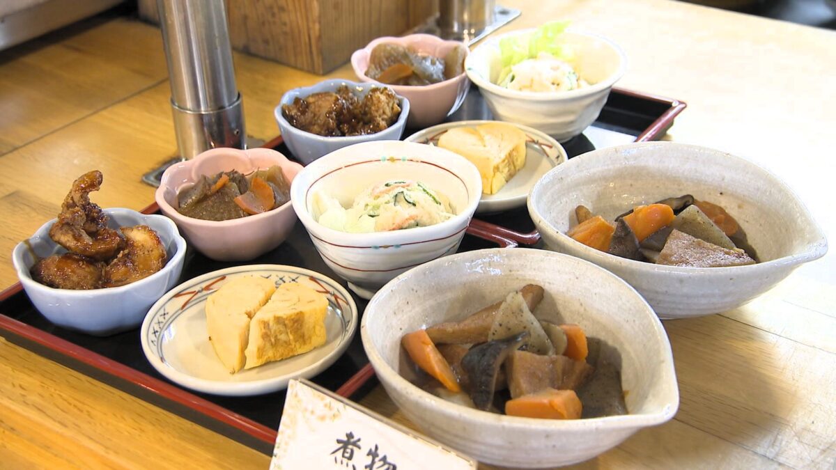 自分で好きなおかずをチョイスしていくセルフ定食スタイル。季節の食材を使った料理の数が豊富で、どれもこれも美味しそうで、お盆に盛り付ける手が止まりません!