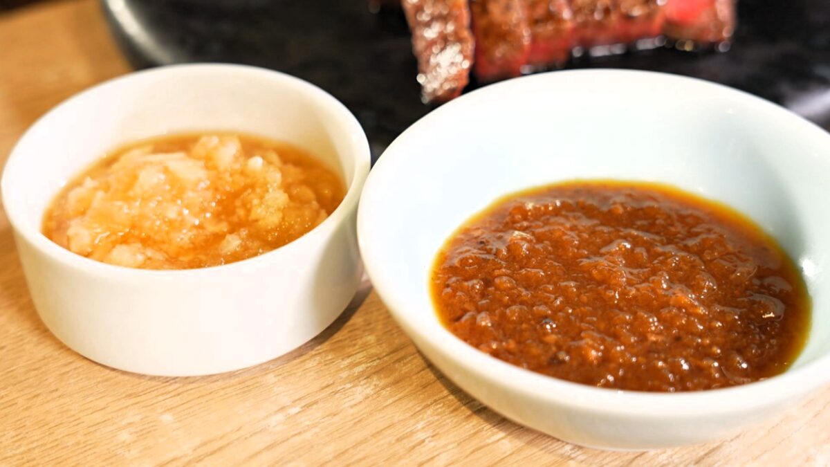 自家製ステーキソースと鬼おろしポン酢の2種類のタレが用意されており、食べるたびに異なる味わいを楽しめます。