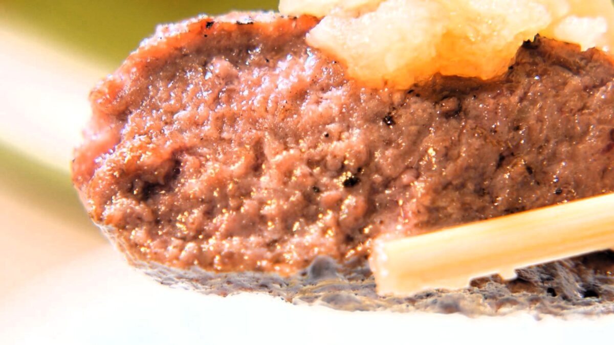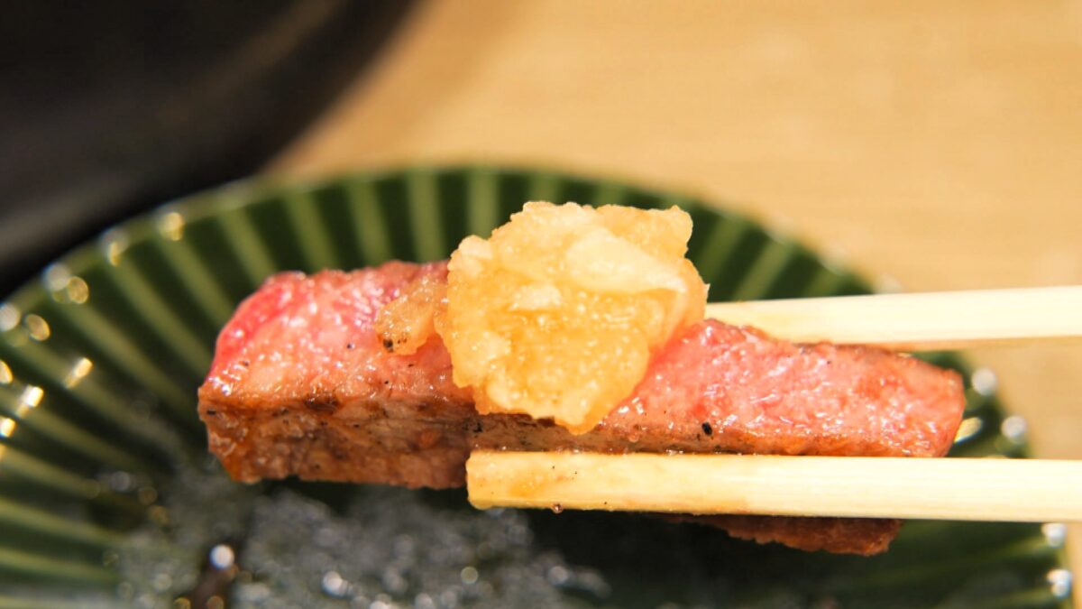 焼き上げると表面は炭火で香ばしく、中は超レアの状態です。