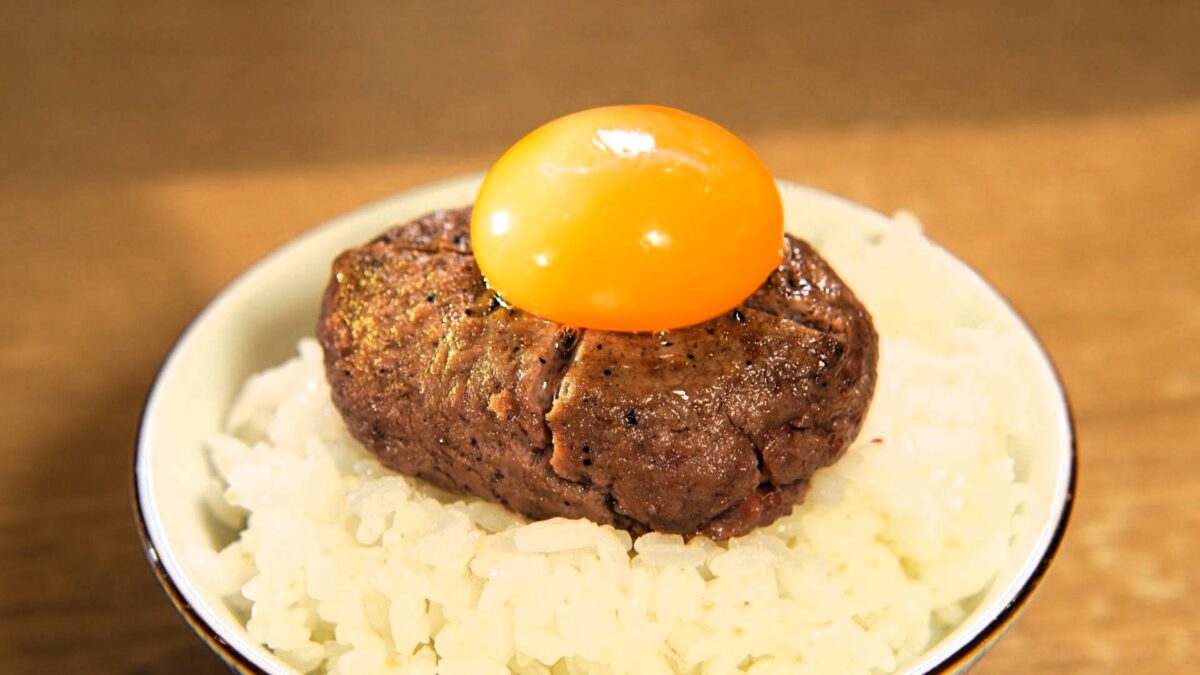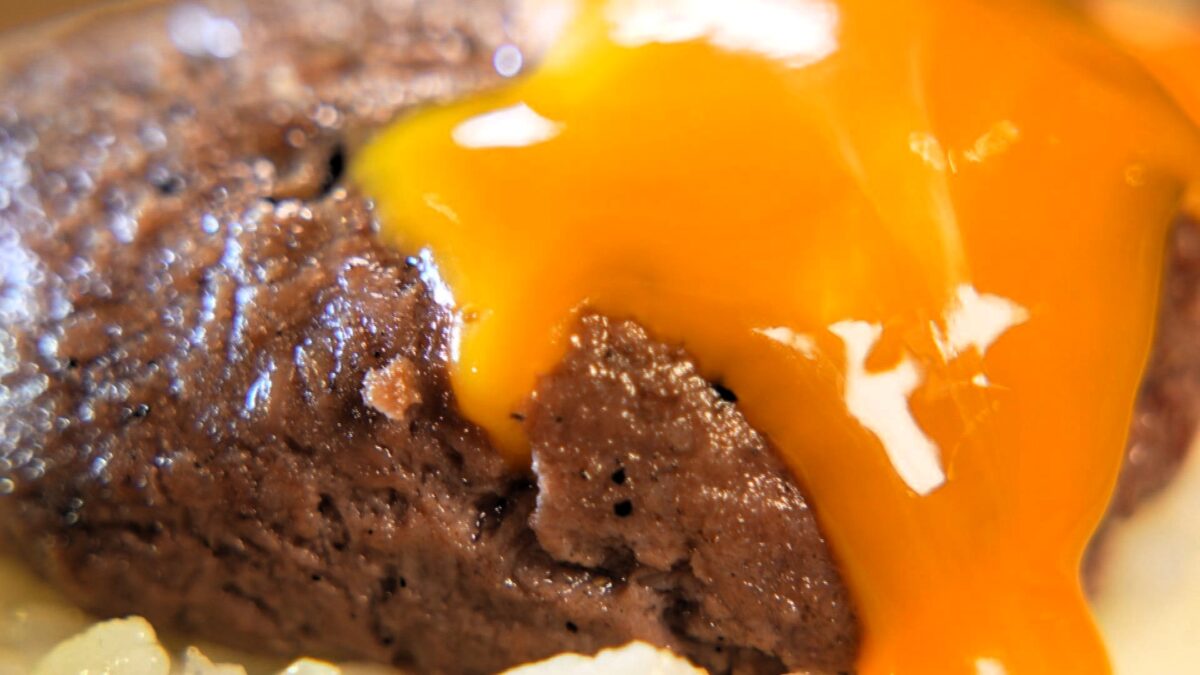 ご飯の上にハンバーグと卵をのせ、ステーキソースをかけると、卵が肉の旨みを包み込み、甘みがより引き立ちます。