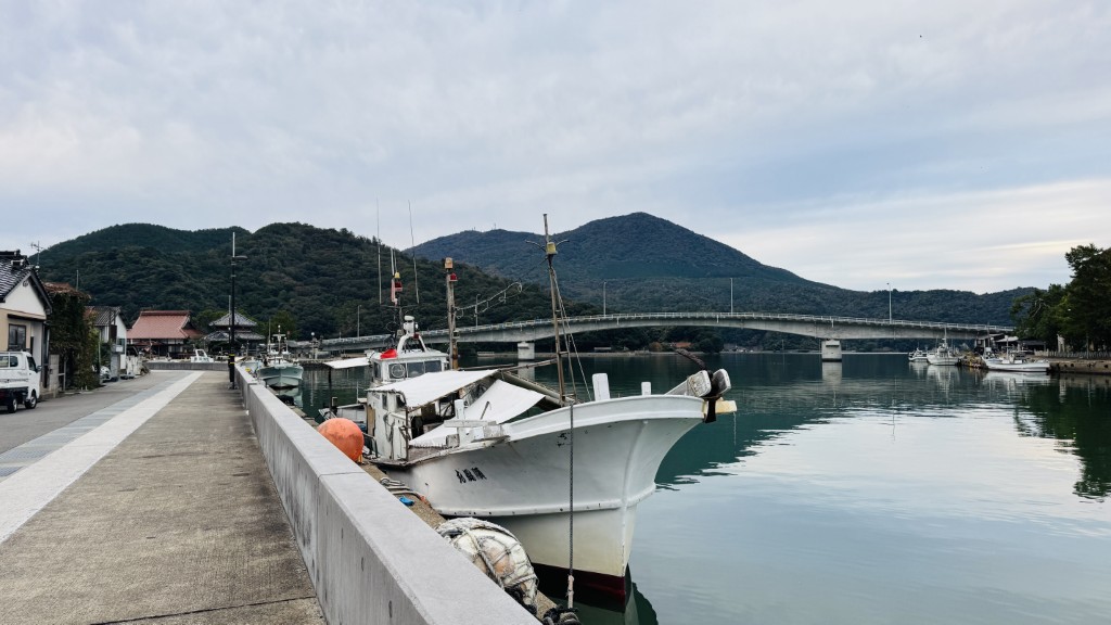 窓の外には古い町並みと船、そして江崎大漁橋。オーナーは「何か特別なものがあるわけじゃないけれど、この風景が好きなんです」と笑顔で語ってくれました。