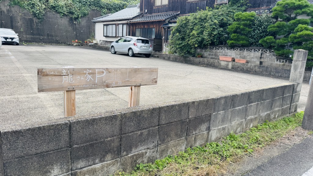 駐車場は萩方面から「龍さん家」を通り過ぎて2軒隣、広い駐車場の手前4か所になります。