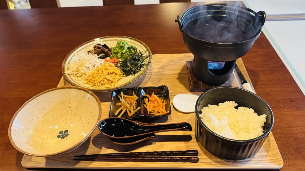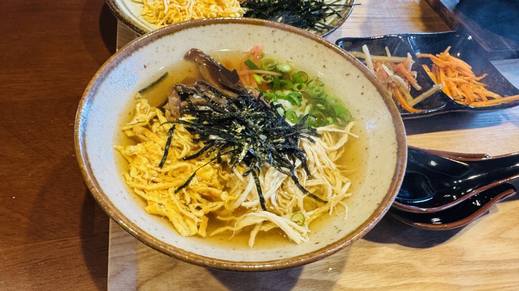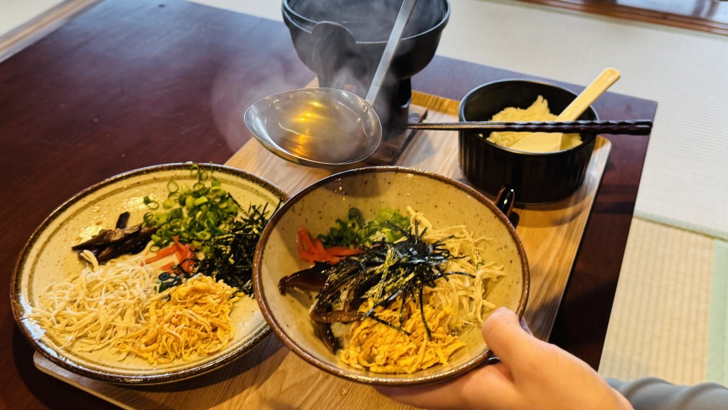 干ししいたけ以外は一切味付けせず、鶏ガラスープと素材本来の旨味だけを楽しむ至極の一杯。ごはんと具材を盛り付け、鶏の旨味がぎゅっと詰まったスープをひたひたになるまでかけていただきます!
