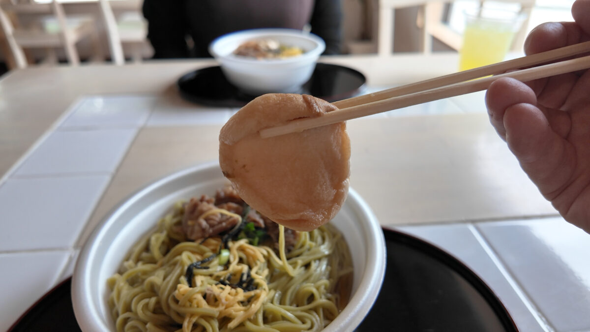 上には甘辛く炒めた豚肉、錦糸卵、刻み海苔、そして大きなお麩が添えられ、彩り豊かな一皿に仕上がっています。そばつゆは少し濃いめで、茶そばの香りとマッチしています。