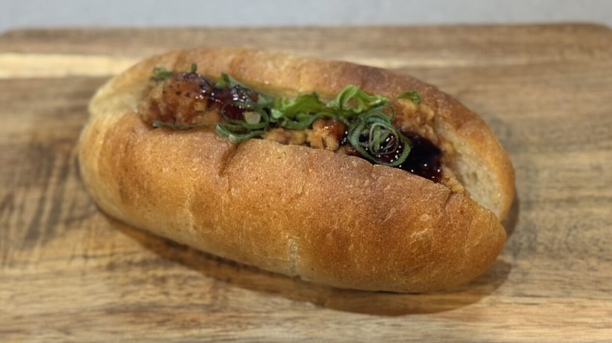 天然酵母のパンのもっちりとした噛み応えのある食感にさっぱりとした「黒酢からあげ」が最高に美味しい一品です。