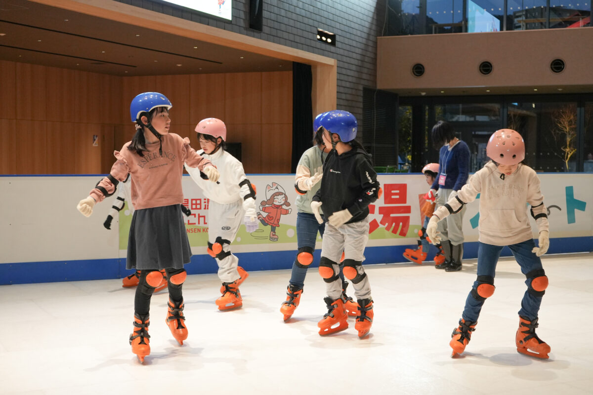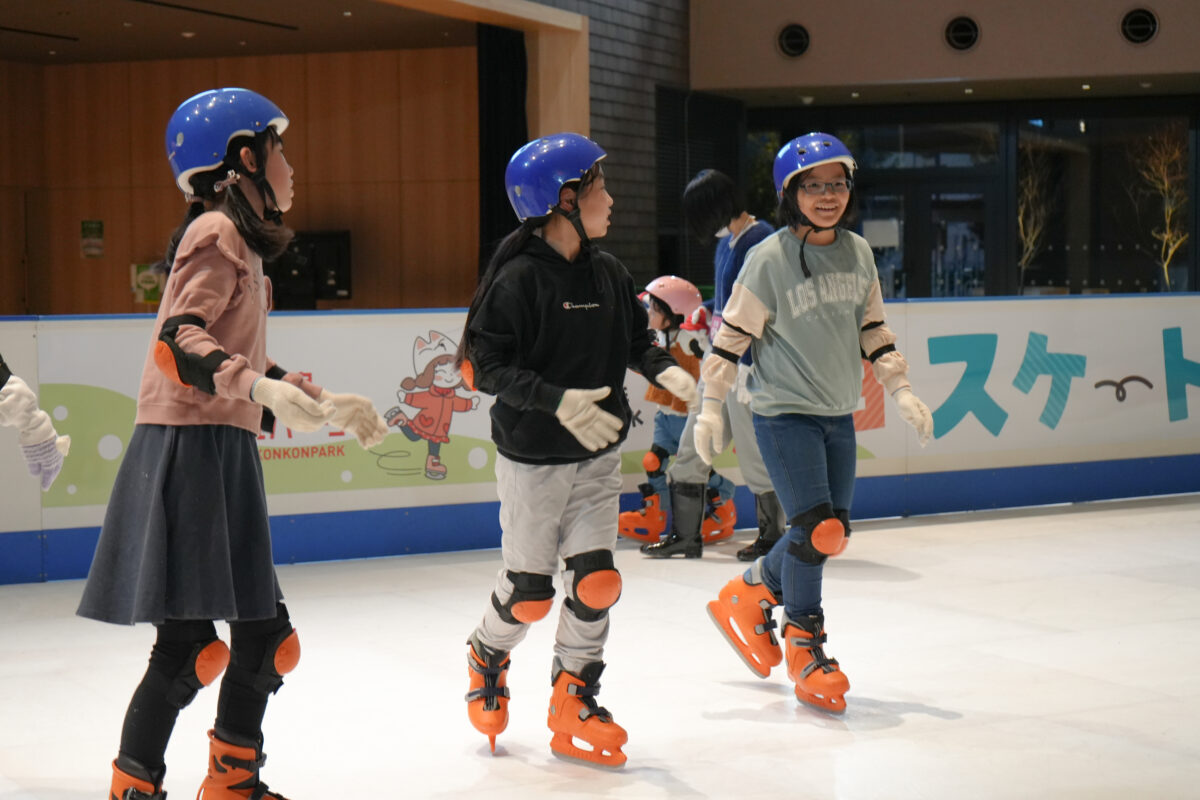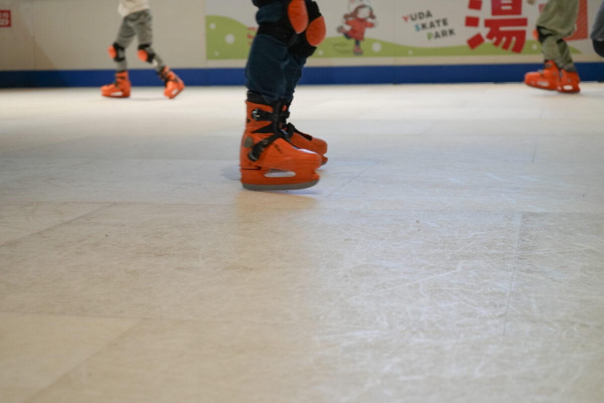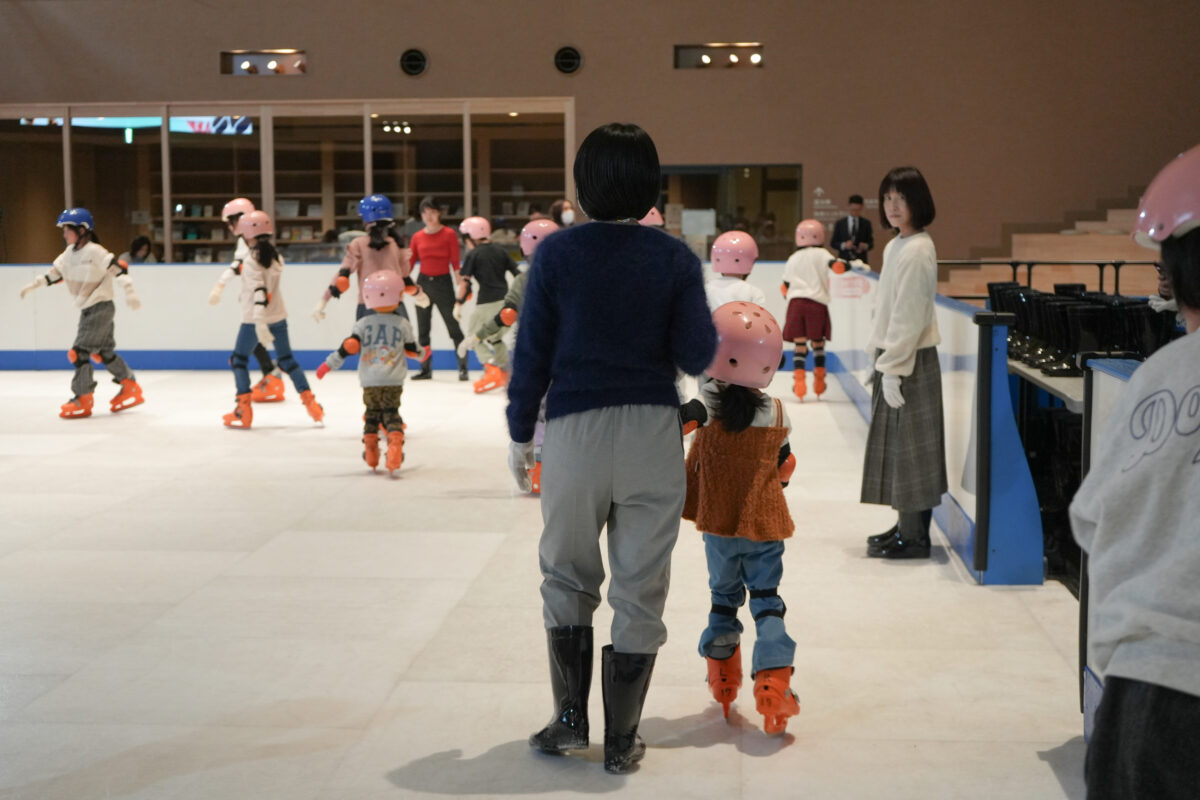 準備ができたらリンクへ。子供たちは、はじめは滑り方に慣れなくて、恐る恐る滑ったり、尻もちをついたりしてしまうこともありますが、少し滑るとすぐに慣れていきます。
