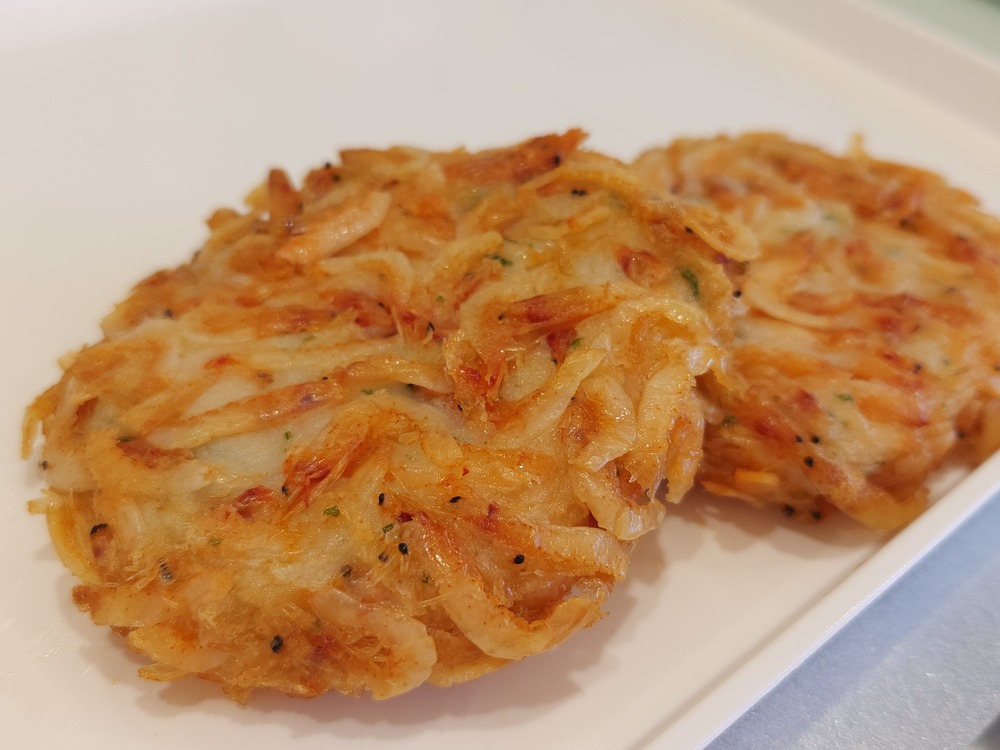 表面にたっぷりまぶされた桜エビ!まさに、大漁です(笑)ひと口いただくと、口の中は桜エビの風味と旨みでいっぱいになります!しかも、すり身と合わせて旨みの塊といっても良いくらい、美味しい天ぷらでした。