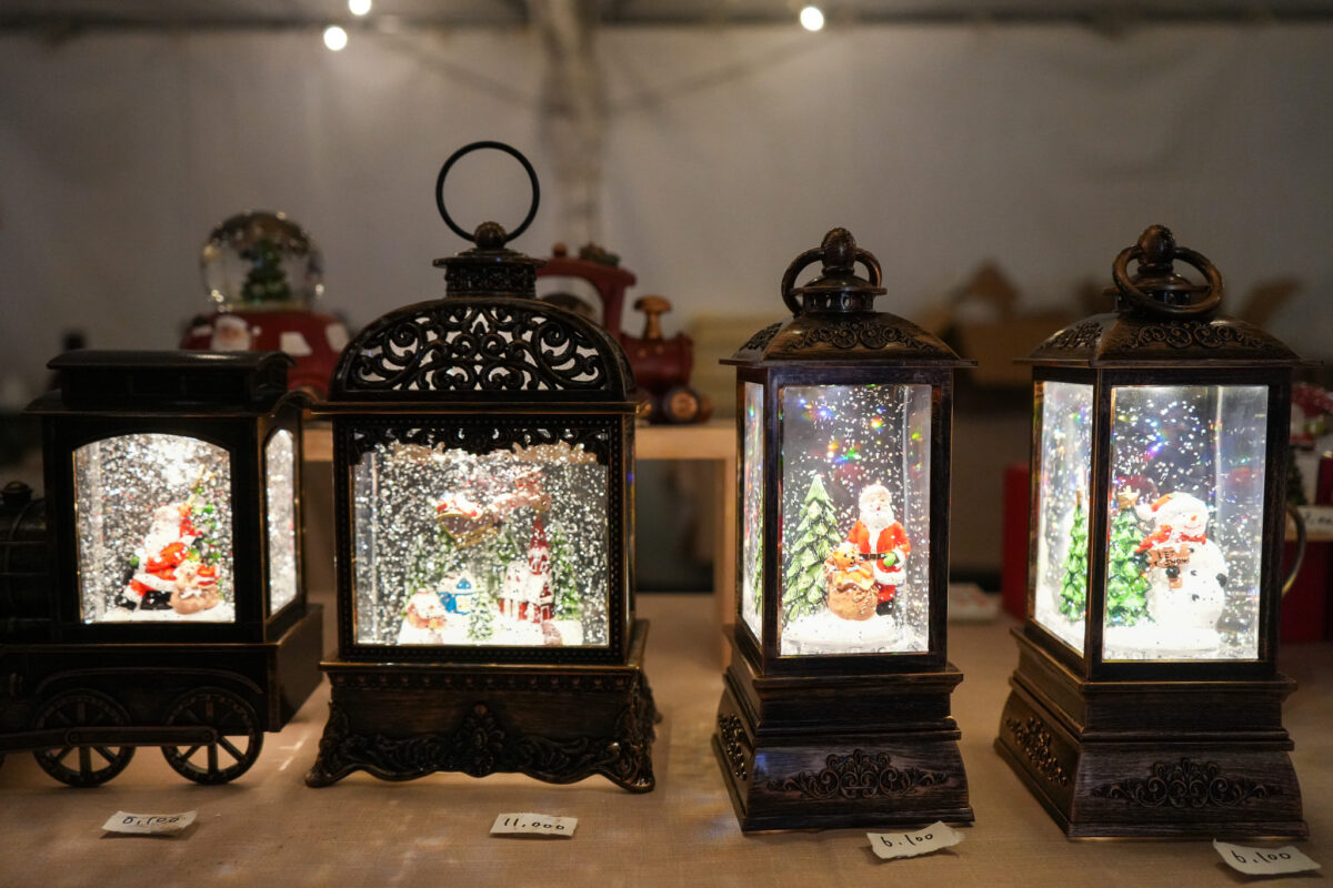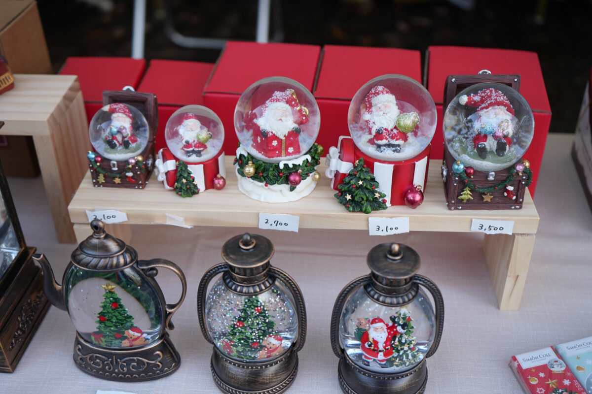 クリスマスといえばやはりスノードームは欠かせませんが、宝箱に入ったサンタさんやクマさん、車や汽車など大小さまざまなタイプ9種類を取りそろえています。