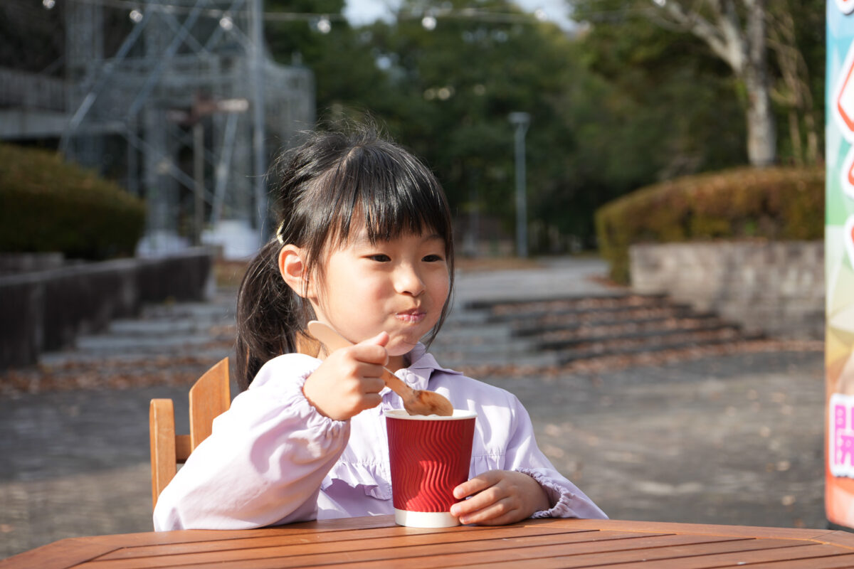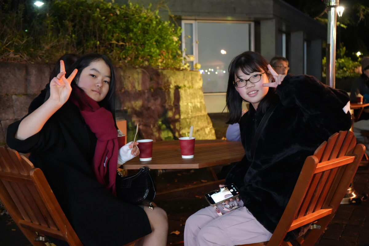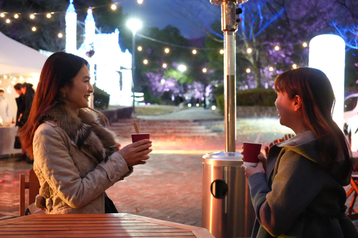 子どもだけじゃありません。日没後、亀山公園のイルミネーションをバックに、自分への甘いご褒美のチョコを飲みながらおしゃべりする大人の姿もみられましたよ。