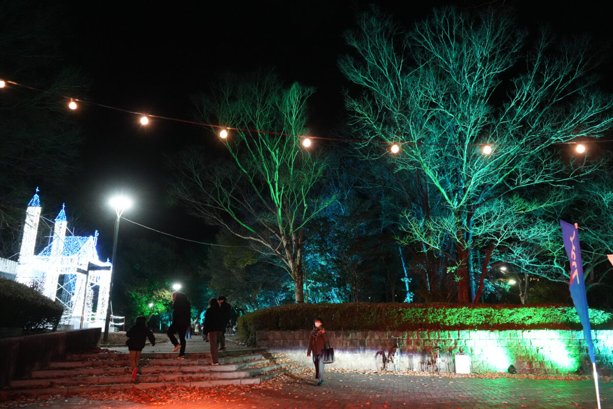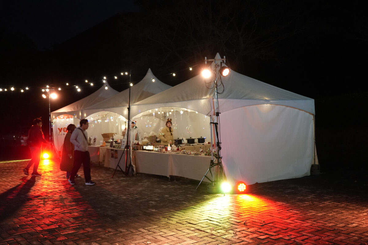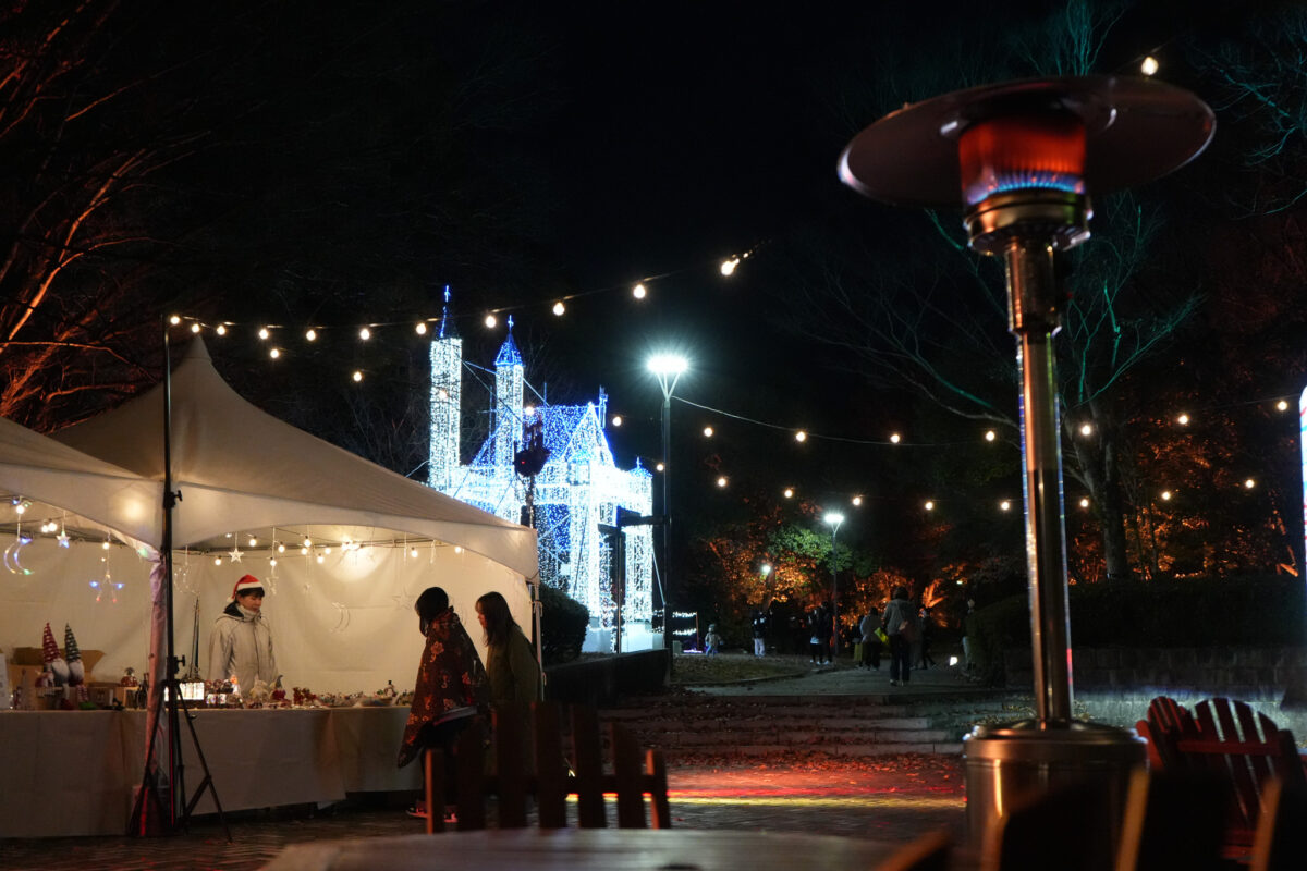 「小さなクリスマスマーケット」の舞台は、山口県立美術館のすぐ横に位置する亀山公園。山口市民にとってはお馴染みの散歩コースですが、この時期は夜になると表情が一変します。