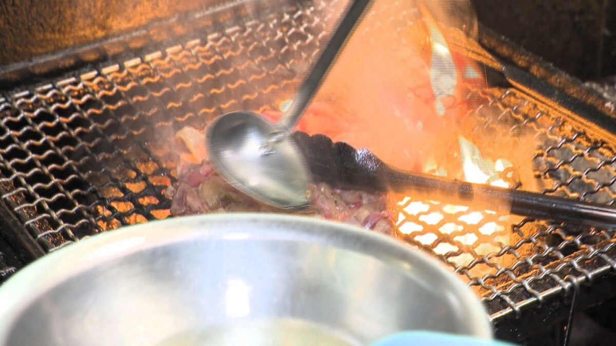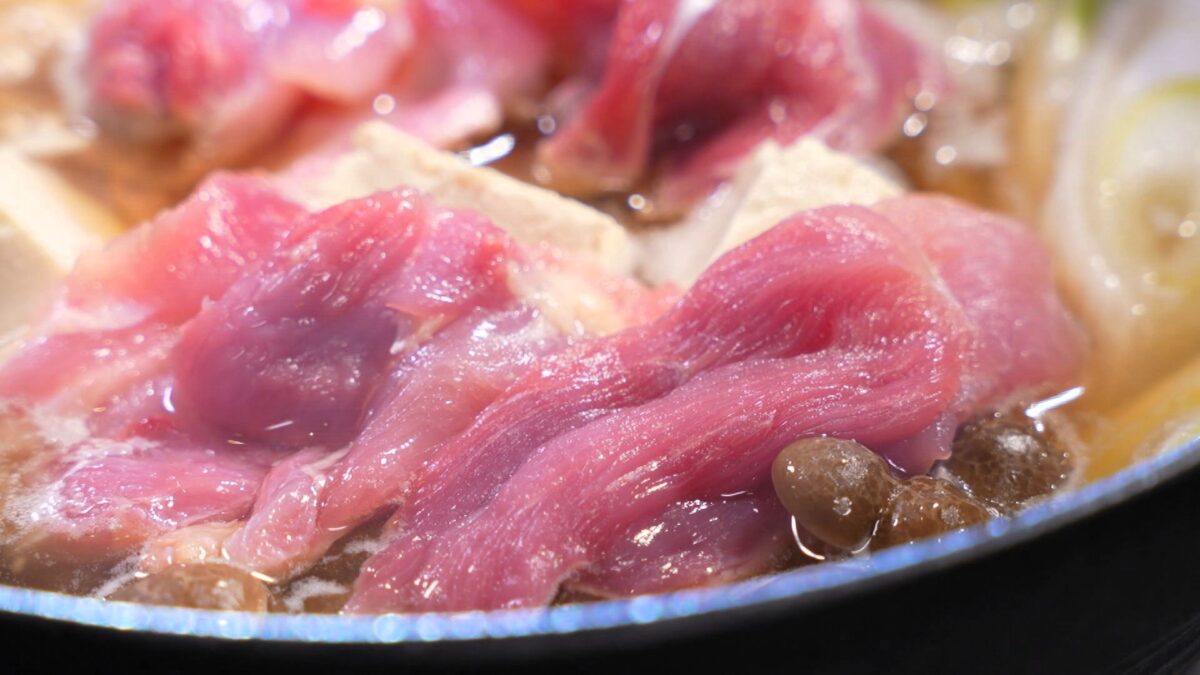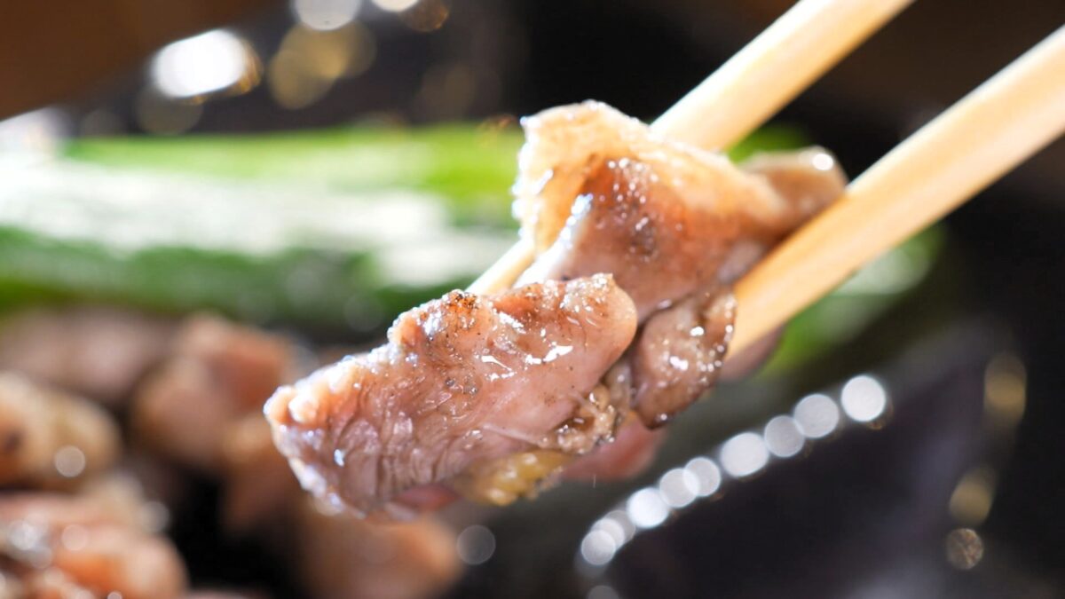 お肉は、新鮮さがひと目で分かる鮮やかな濃いピンク色。 これを、鶏ガラと香味野菜を2時間じっくり煮込んだ特製スープにくぐらせます。「お肉の色が変わってから15秒〜20秒がベストタイミング」とのことで、さっそくパクり。 炭火焼とはまた違う、スライス肉ならではの「プリップリ、コリッコリ」とした食感が楽しい!