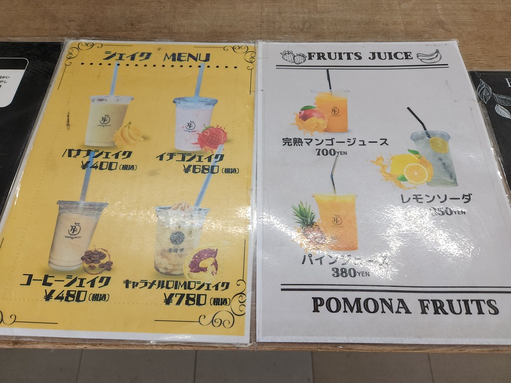 シェイクは、フルーツ専門店「ポモナフルーツ」を併設したふじみやならではのバナナやいちごを使用しています。フルーツジュースもあり、お芋以外にも様々な飲み物が楽しめます。