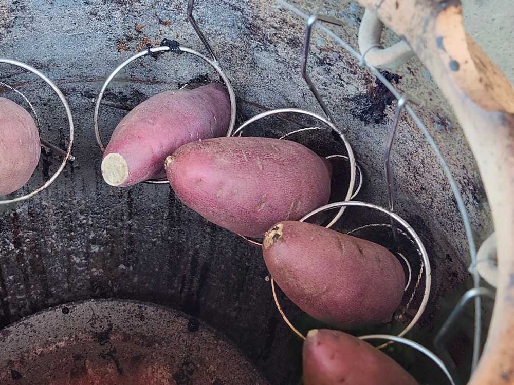 底には炭火の入った七輪があり、なんと、芋は一本一本吊るされた状態で焼き上げます。一般的な焼き方とは異なり、炭火の熱と壺の中の反射熱を利用して、じっくり1時間半~2時間かけて焼き上げるので、皮も焦げることなく、さらには、水分も逃がさずしっとりと美味しく焼き上げることができます。