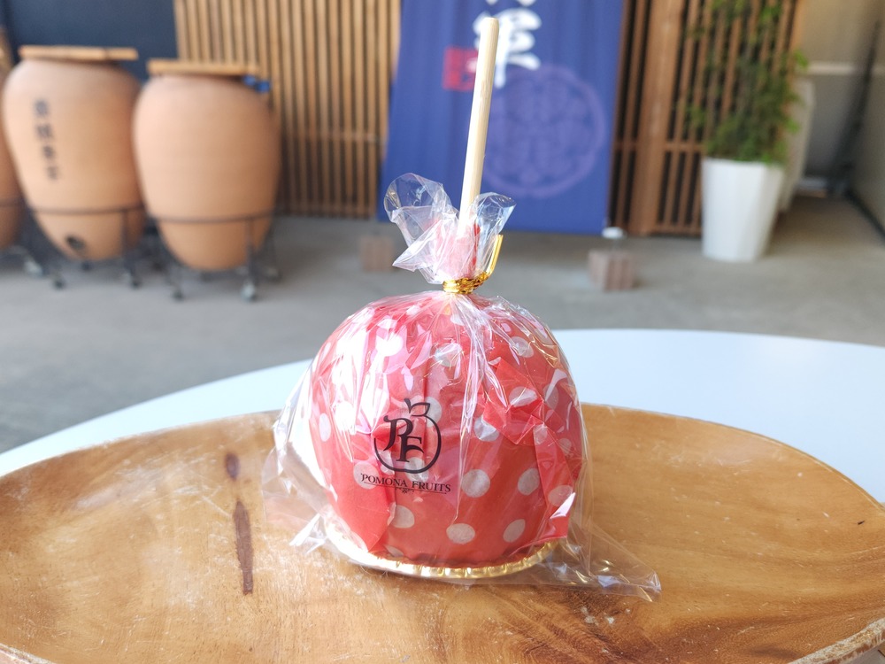 ポモナフルーツのりんご飴です!有袋ではなく、太陽の光を浴びた「サンふじ」を使用したお店手づくりのりんご飴も、とってもおいしいんです!