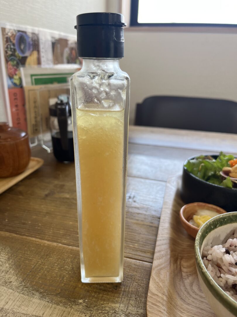 日替わり定食のサラダにはぜひ生ドレッシングをかけてみてください。すりおろしの玉ねぎが生でそのまま使用されています。