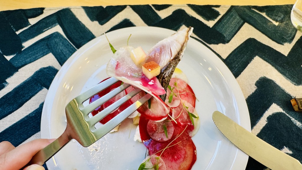 - 〆鯖と根菜のサラダ仕立て 自家製スモークリコッタチーズとサワークリーム