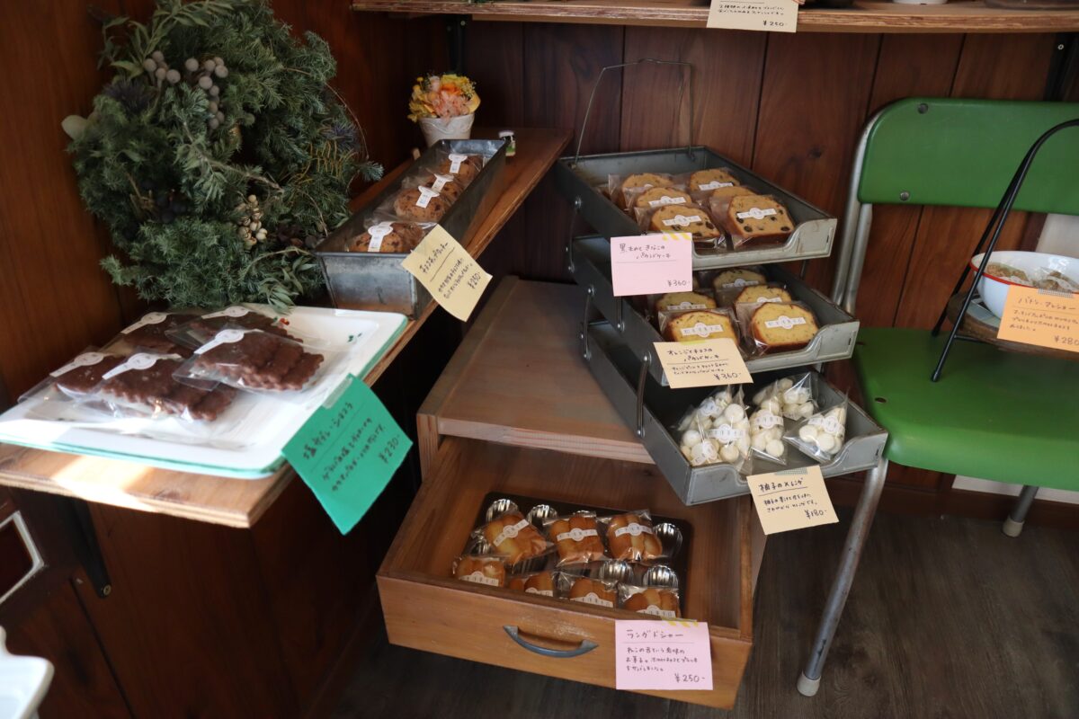 棚で見つけて思わず「かわいい!」と声を上げてしまったのが、こちらのオリジナルのクッキー缶です。 レトロな雰囲気の缶を開けると、中には店主さんのこだわりが詰まった焼き菓子がぎっしり!