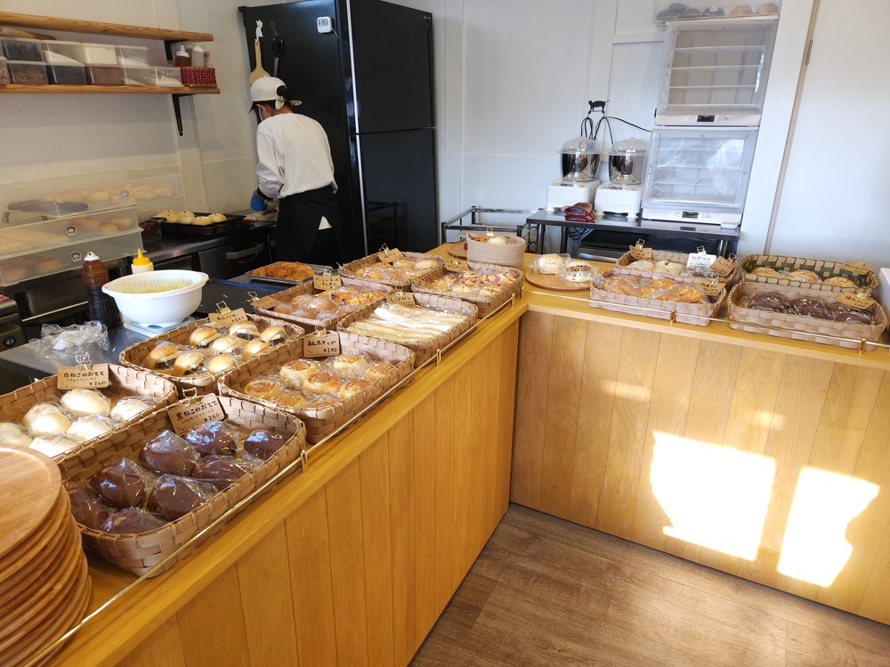 店内はこじんまりとしていて、パンの良い香りに包まれながら、カウンターに並ぶパンを自分で選んで取ることができます。カウンターに沿ってキッチンもあるので、時間によってはパンを製造する様子なども間近で見ることができますよ。