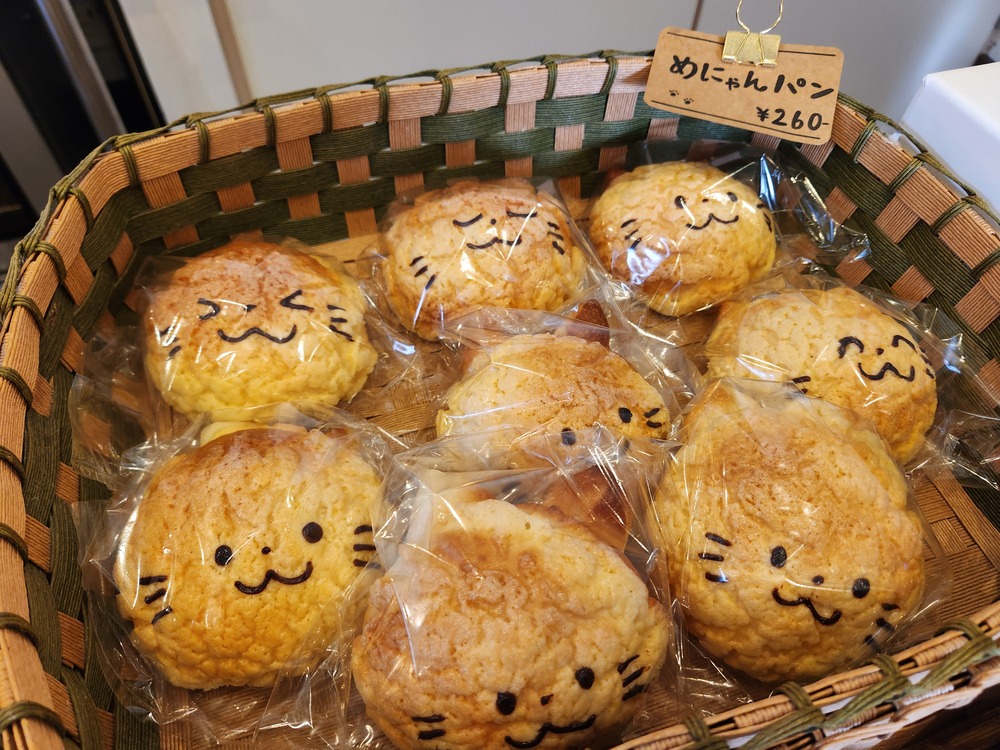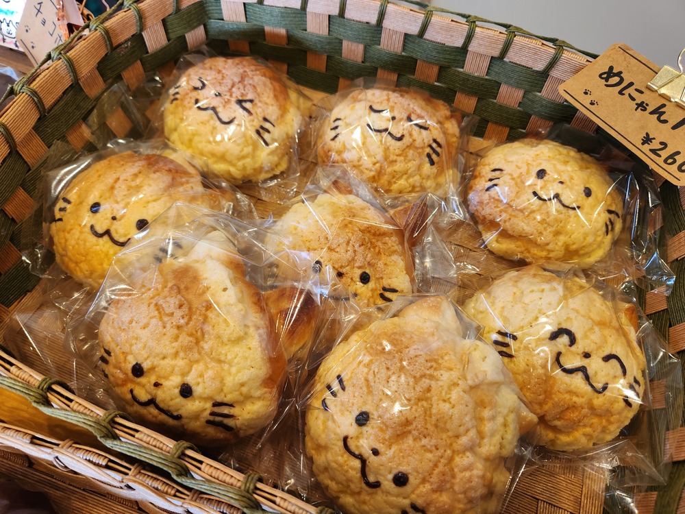 お馴染みのメロンパンに猫の顔を描いたかわいらしいパン!よく見ると、表情も一つひとつ異なり、どのお顔のめにゃんパンを選ぼうかと迷っちゃいます!なんだか食べるのももったいないくらいです。