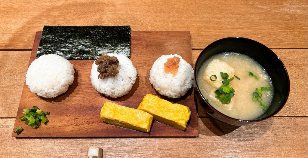 吉田さんの愛情が詰まったランチセット「nodokaプレート」は、塩むすびの他に、具材入りのおむすび2つ・お味噌汁・卵焼きが楽しめます。