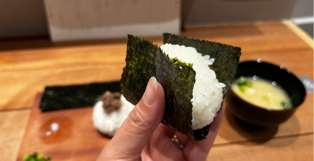 パリッとした海苔の香ばしさと、お米にまとった塩の風味。そして何より印象的なのが、ふんわりとした握り加減でした。外はほどよく形を保ちつつ、中は空気を含んだようにふわり。軽やかな食感で、ついパクパク食べ進めてしまいます。