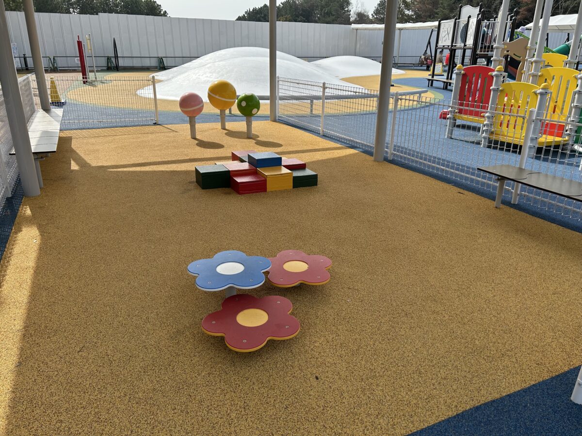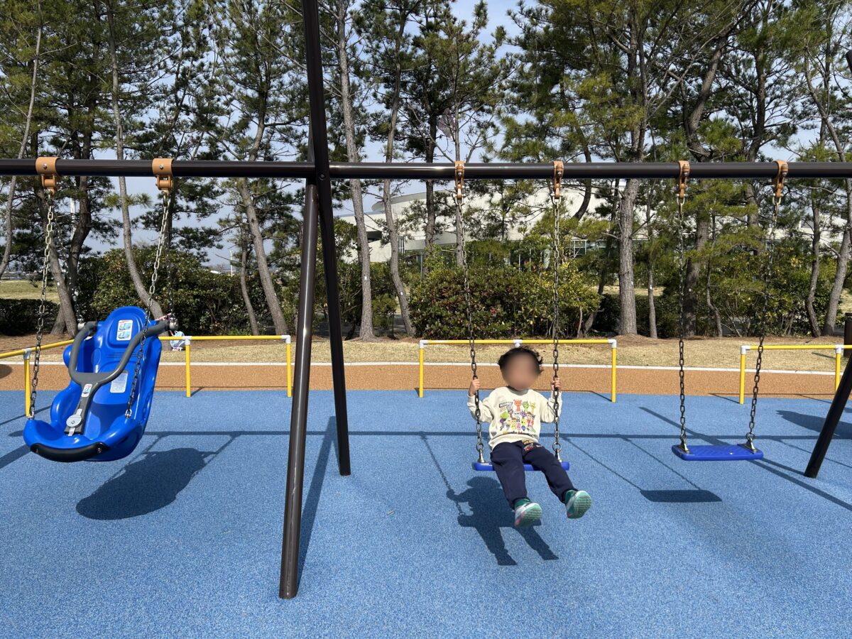 園内には複合遊具をはじめ、体を使って遊べるさまざまな遊具が設置されており、子どもたちが思いきり体を動かせる環境が整っています。足元は柔らかい素材で舗装され、小さな子供も歩きやすいよう配慮されていました。