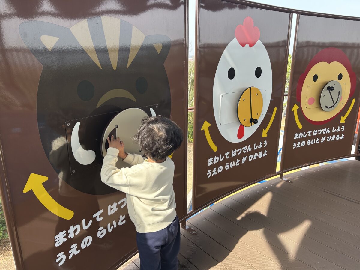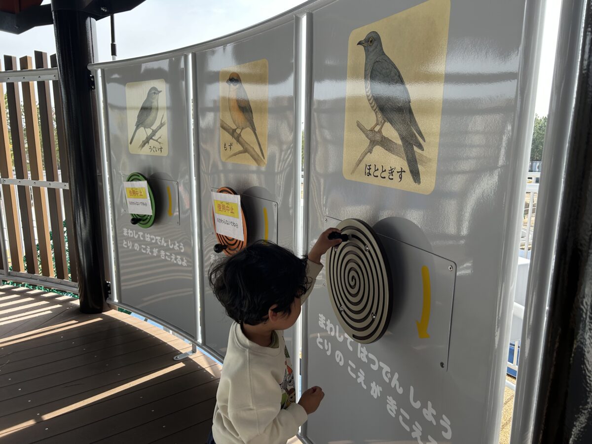 レバーをくるくる回して発電すると、鳥の鳴き声が聞こえてくる遊具も。