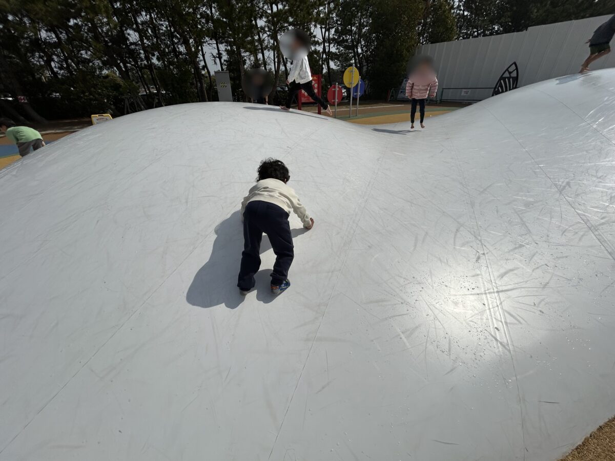 靴を脱いで遊ぶ遊具ですが、朝早い時間だと朝露で濡れているので、表面が濡れていないかしっかり確認してから遊ぶようにしてくださいね。