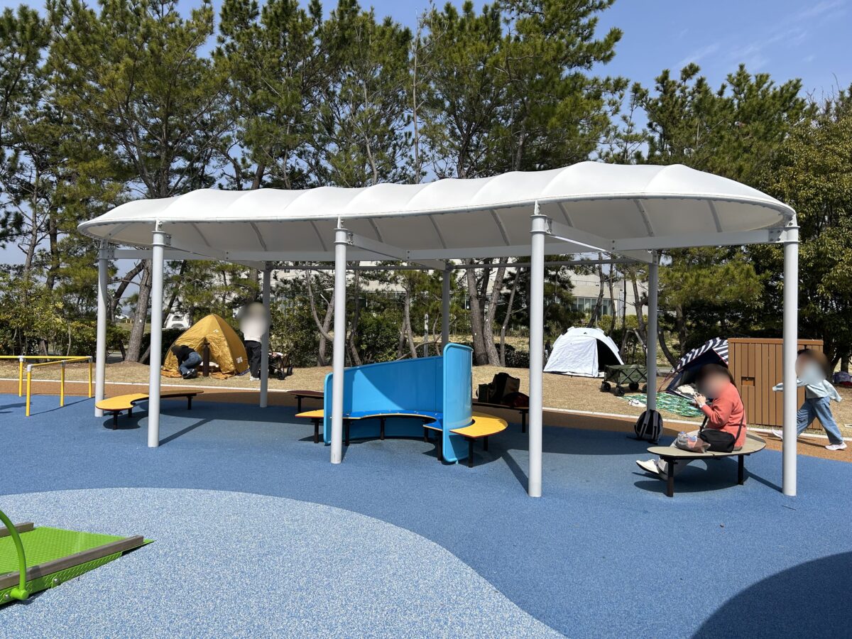 「きららんど」は、大人が休憩できる屋根付きのスペースが複数あります。とはいえ、時間帯によっては日差しが差し込んでくるので、帽子や日傘といった日よけアイテムがあると心強いです。特に夏場は暑さ対策をしっかり行うようにしてくださいね。