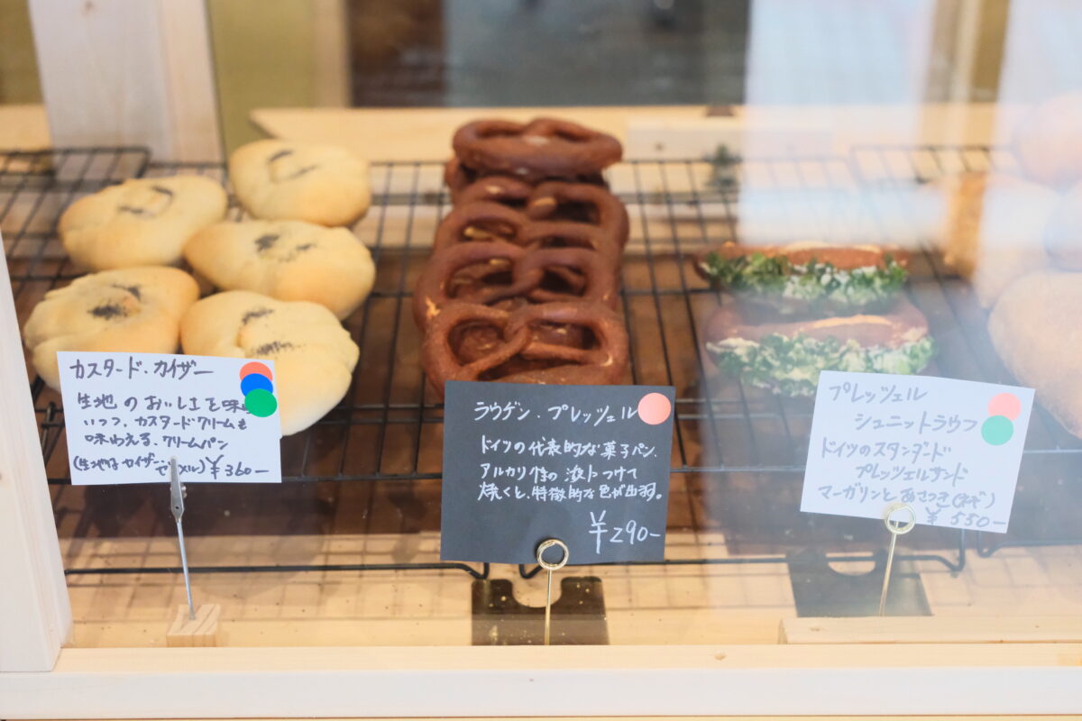 ドイツ系のパンとあって、ショーケースには耳慣れない名前のパンがずらり。「これはどんなパンだろう?」と、ついのぞき込みたくなります。パンの価格は180円〜1,400円ほど。