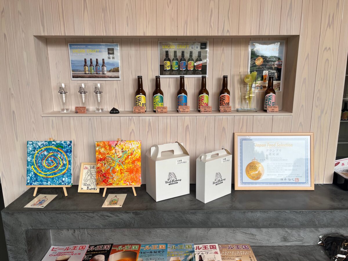 レジ横には、クラフトビールのラインナップのほか、もち米、うついブルワリーのキャップ、「ビール王国」の雑誌、ラベルデザインを手がけたデザイナーさんの作品も並びます。