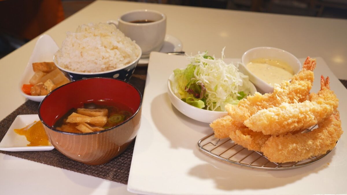 大きなエビフライが5本も並ぶ、見た目にもインパクトのある定食です。店主によると、材料費が上がる前は6本出していたこともあったのだとか。サービス精神の大きさが伝わってきます。