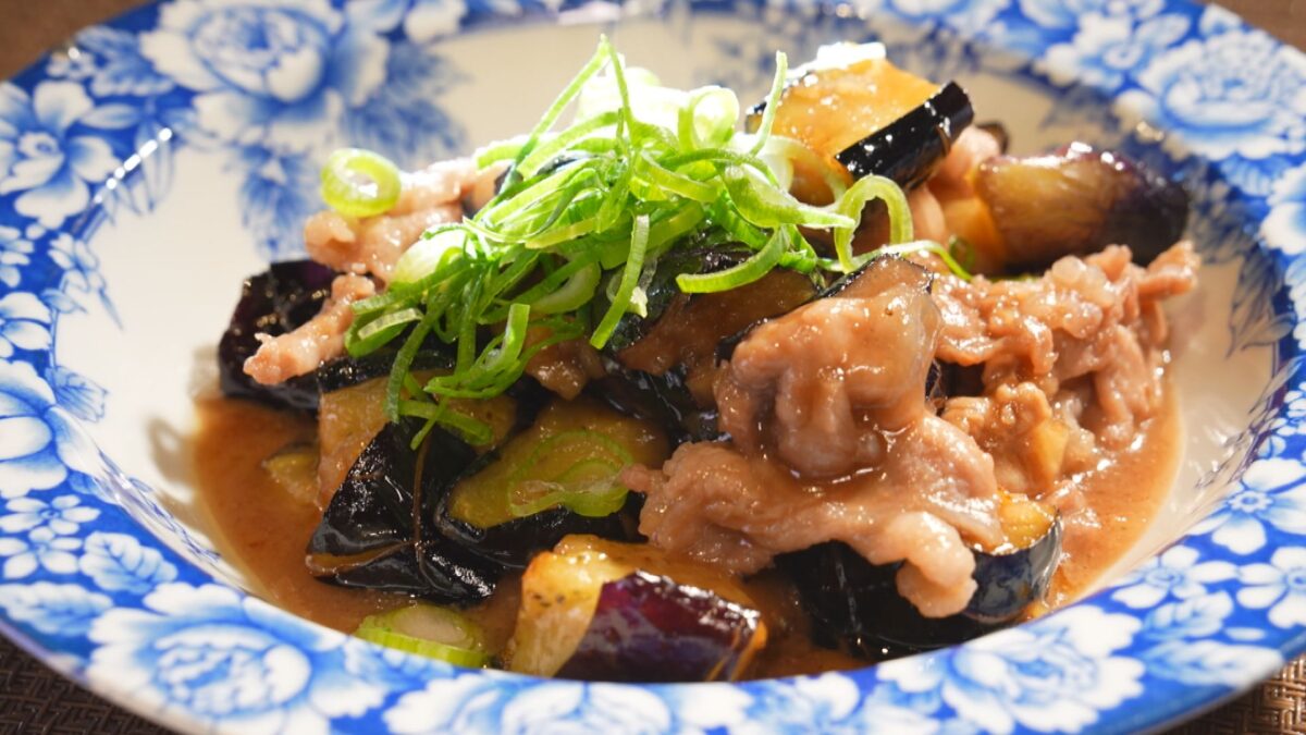 ナスには細かく切れ目を入れ、味がなじみやすいようひと工夫。さらに一度揚げることで、とろっとやわらかな食感に仕上げています。そこに、ボイルした豚肉と自家製クルミ味噌を合わせれば、ごはんが進む一皿に。
