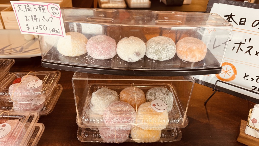 「甘味処あんず」では、大福やお団子、わらびもちなど、お持ち帰りの商品も常時5種類以上が並んでいます。季節限定の商品もあるため、訪れるたびに違った楽しみに出会えるのも魅力です。