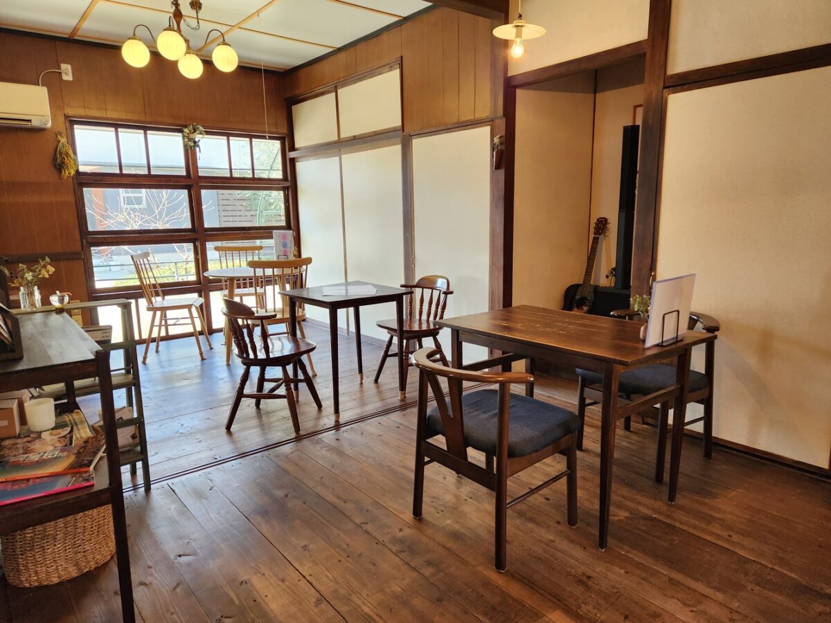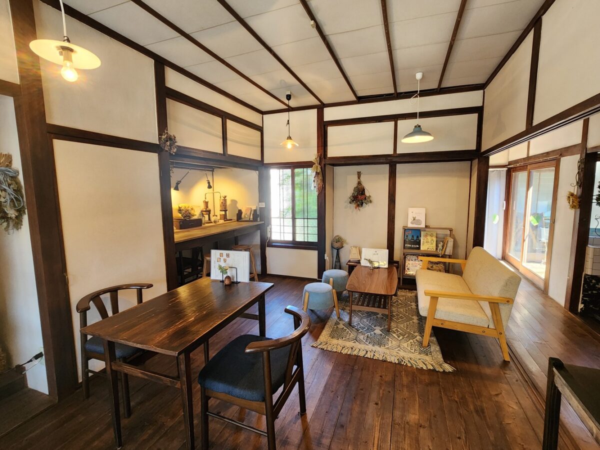 店内は、古民家ならではの木材の風合いが心地よく、温もりが感じられる落ち着いた雰囲気。テーブル席の他にソファ席もあり、押入れだったスペースを活用したカウンターもあります。