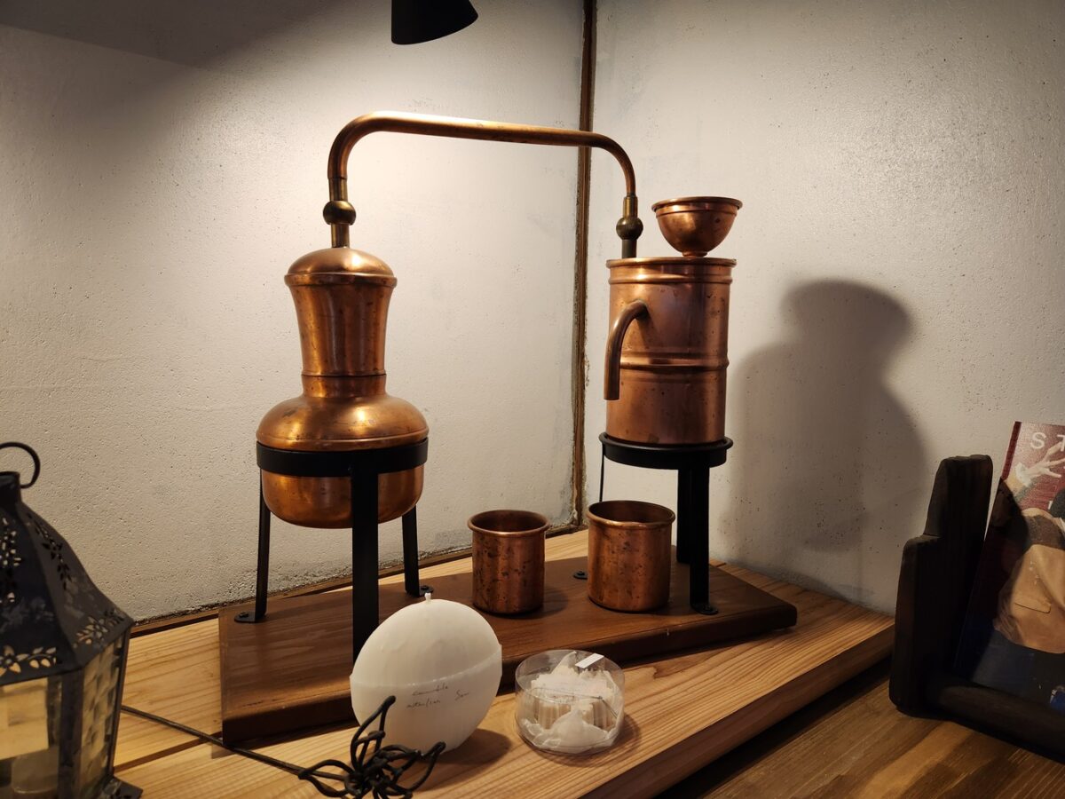 カウンター席には、「れんげハウス」時代に使用されていた花の精油を絞る蒸留器もディスプレイされていました。