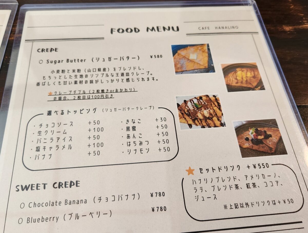 こちらでは、ワンハンドでいただく巻いたタイプのクレープではなく、お皿に盛りつけられ、ナイフとフォークでいただくスタイル。小麦粉に山口県産の米粉をブレンドした生地に、砂糖とバターをトッピングした「シュガーバター」は、フランス風クレープの王道と言える一品です。プラス550円でハナリノブレンドやラテもセットドリンクとして付けることができますよ。