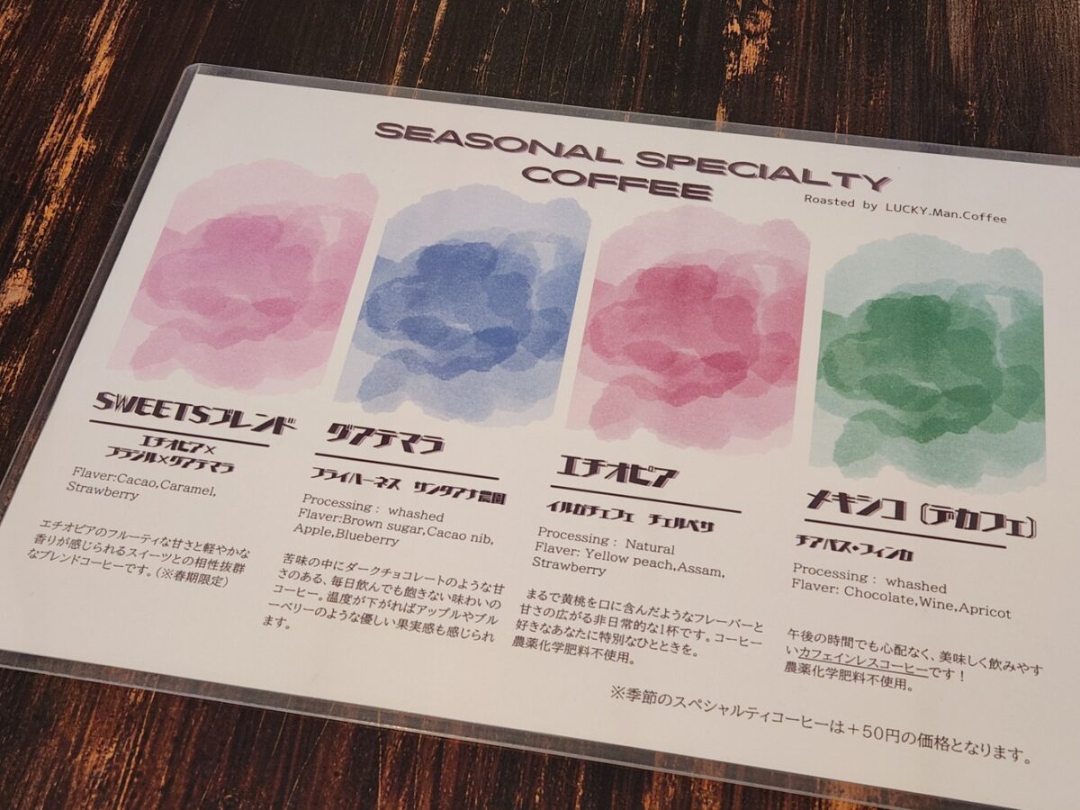 「ハナリノ」のコーヒーは、山口市や防府市に出店しているスペシャルティ珈琲豆専門店「LUCKY Man Coffee」さんが焙煎した珈琲豆を使用しています。農薬や化学肥料不使用の豆を中心に取り扱っているそうで、一杯ずつ丁寧にドリップして提供しています。定期的に銘柄もかわるそうで、その時々におすすめのコーヒーに出会えるのも魅力ですよ。