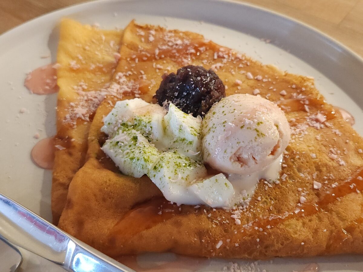 あんこと桜風味のバニラアイス、そして、杏仁豆腐がトッピングされたクレープです。桜ソースがかかっているのですが、桜の風味がほんのりと香って春らしい季節感を感じつつ、杏仁豆腐のさっぱりとした味わいがアクセントになって、とても美味しかったです!