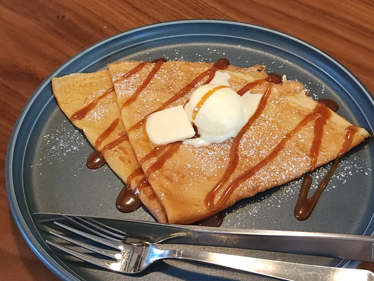 焼き立ての温かいクレープに冷たいバニラアイス、そして塩キャラメルソースをトッピング。間違いのない組み合わせですよね。