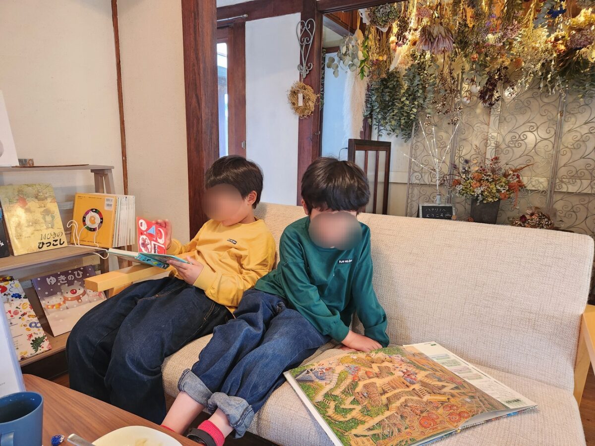 また、「お客さんに自由に過ごして欲しい」と、店内には様々な本も置いてあります。我が家の息子たちも絵本に夢中で、まるで自分の家のリビングのようにくつろいでいました。それも、「ハナリノ」が醸し出す穏やかな雰囲気がゆるやかな時間を生み出してくれるのかもしれません。